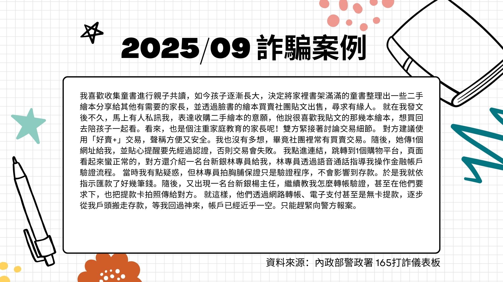 - 詐騙集團潛伏二手兒童書籍買賣社團,冒充誠意購書的家長,靠親子共讀、故事共感等話題拉近距離,讓賣家誤以為對方同為家長、彼此安全可信。