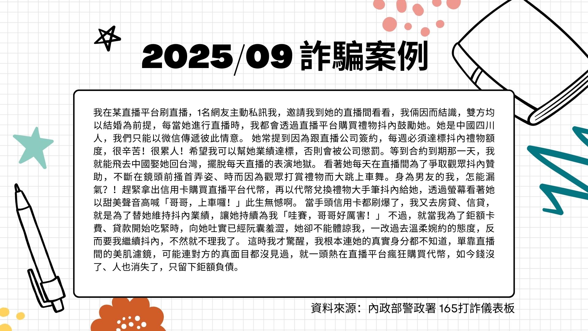 「網路戀愛+直播抖內=身分不明、巨額傷心債」!請守住理性、自主財務,別讓愛情成為詐騙的通路。