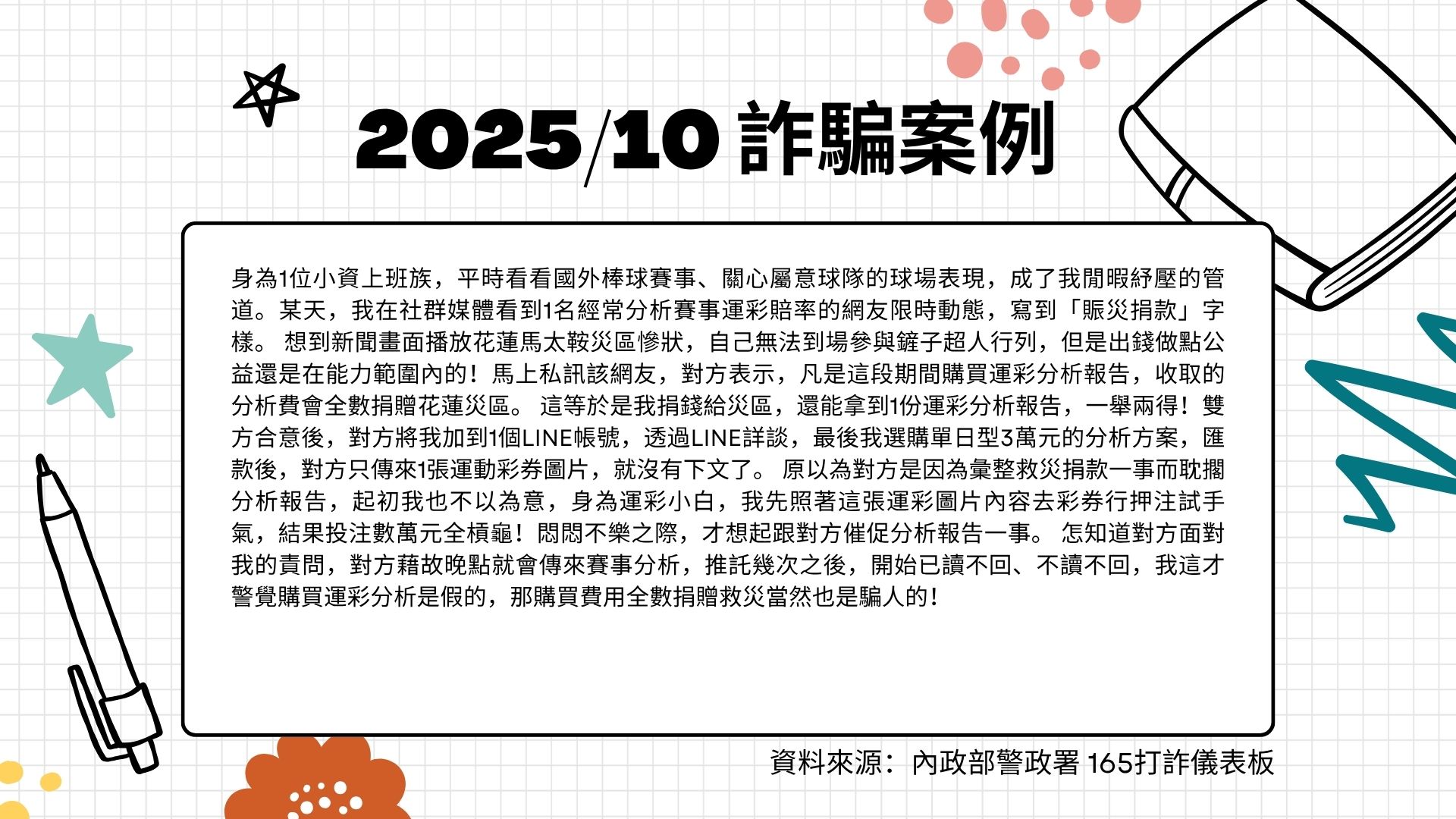 「運彩分析捆綁災區捐贈」是新型詐騙,所有災難捐款務必查證官方正規管道;網路交易只與合法平台進行,切勿交付善心與利益給陌生帳號。