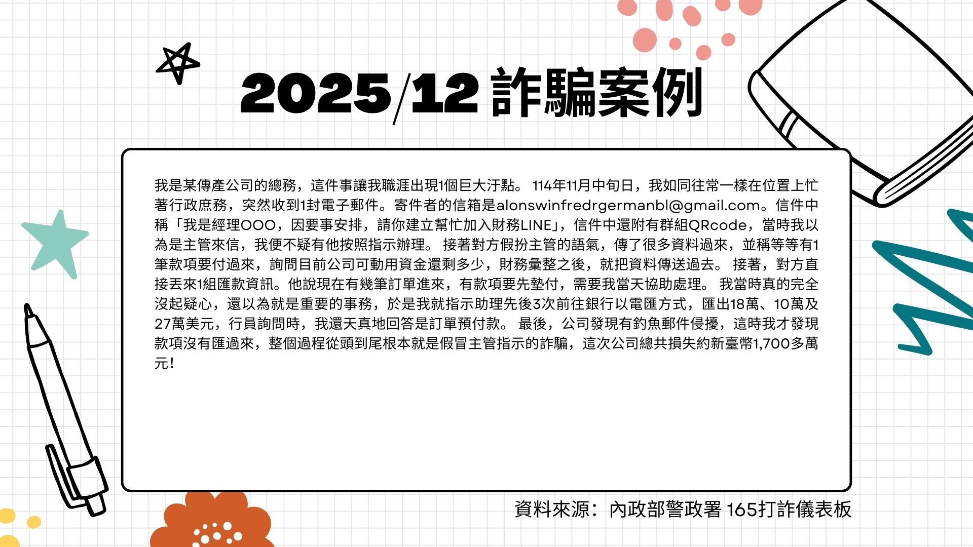 - 公司應定期辦理假主管匯款詐騙教育訓練:將實際案例與損失金額納入內訓,讓財務、採購、總務等人員都能辨識這類假主管詐騙手法。