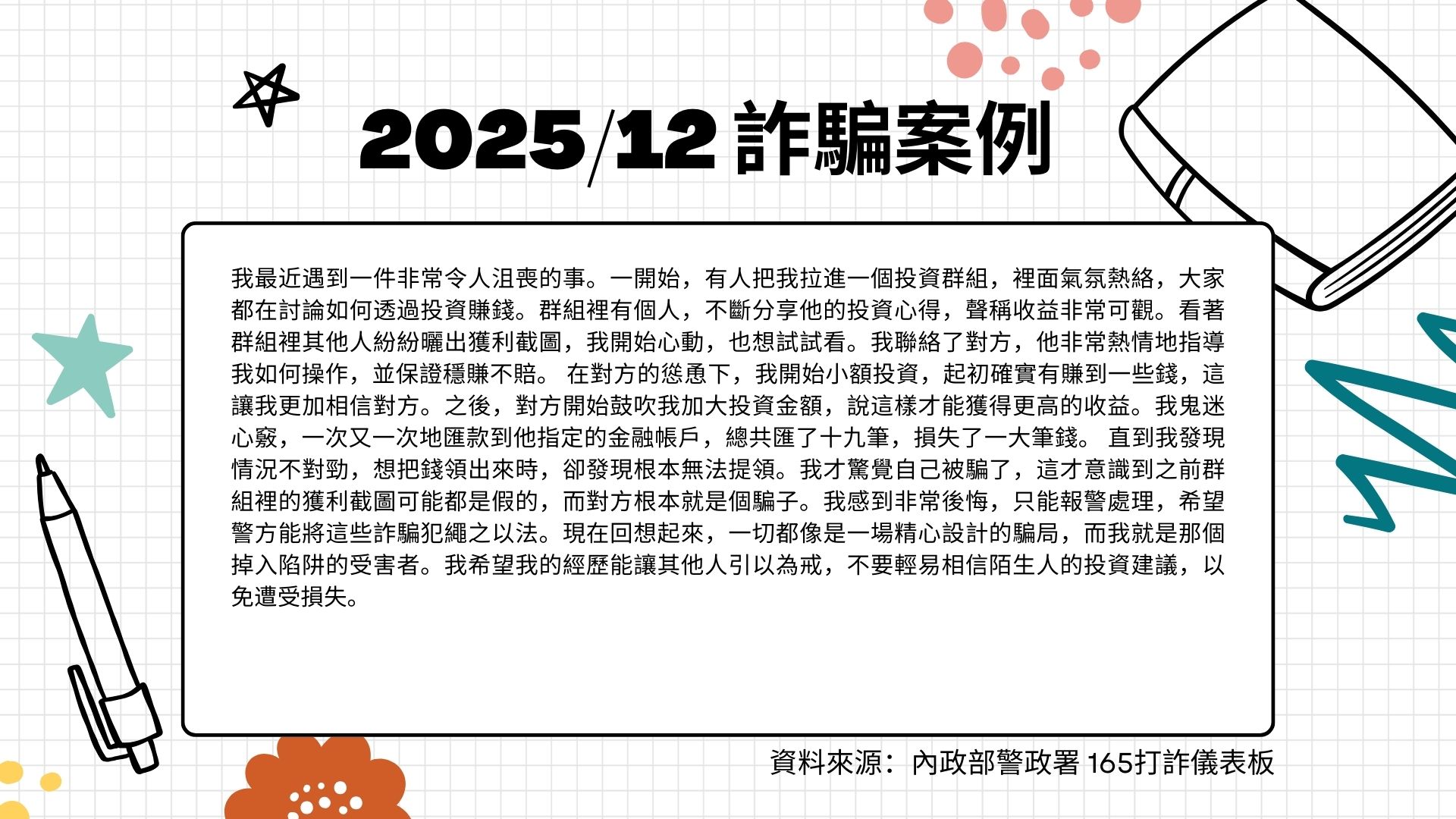- 分享自身受騙經驗,有助於保護身邊的人:向親友、同事與社群說明群組投資詐騙的流程與關鍵警訊,讓更多人知道「保證獲利+截圖曬單+群組帶單」已是高風險警報。