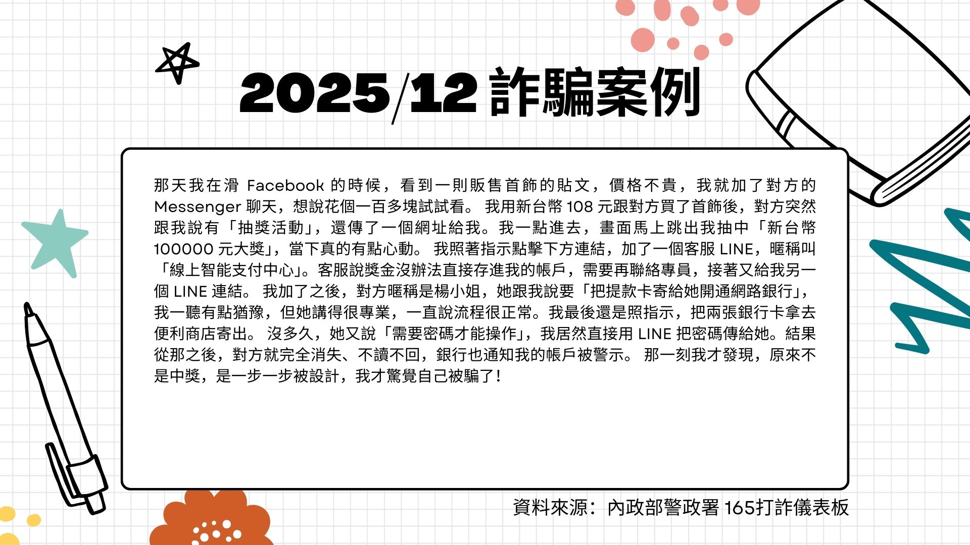 「小額消費+驚喜中獎+寄卡給客服」是近年常見的假中獎詐騙模式。凡是要求寄出提款卡或提供密碼的「領獎流程」,一定要馬上拒絕並中止聯絡,守住帳戶,就是守住你所有的辛苦錢!